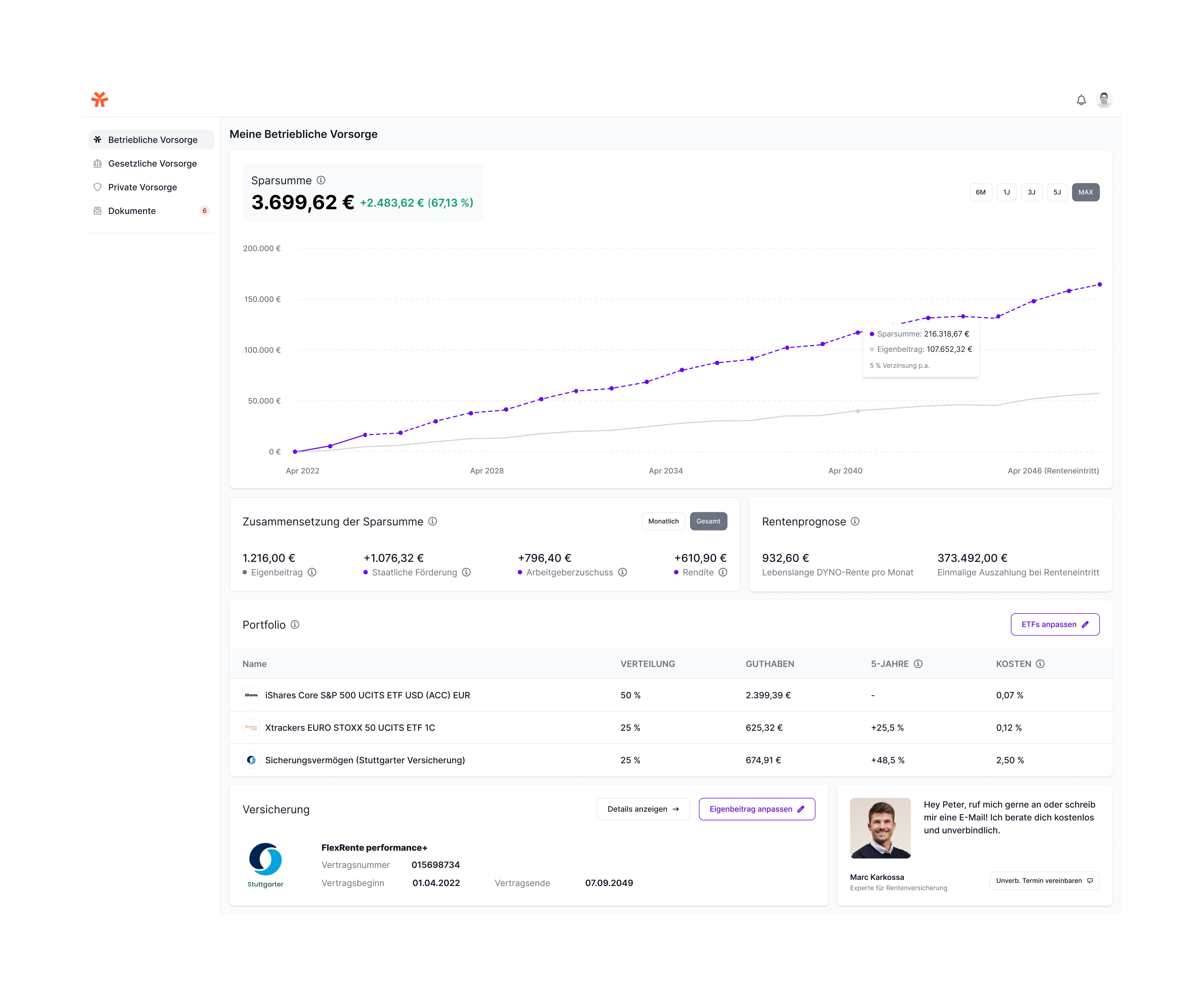 Über das Dashboard behältst du jederzeit den Überblick über deine Ersparnisse, deine Rentenprognose und die Entwicklung deiner ETFs.