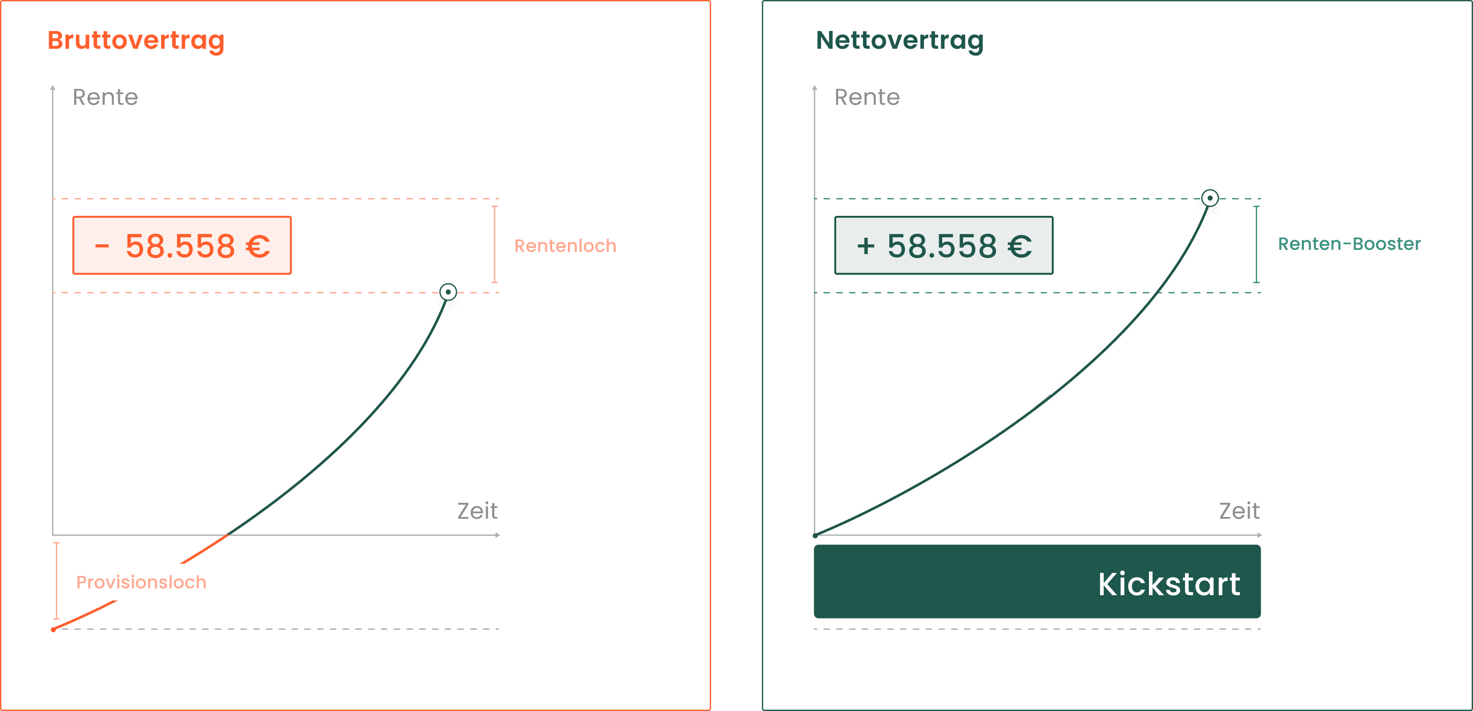 Diese Eliminierung von Provisionen hat einen großen Einfluss auf deine Rendite und dein Rentenkapital. Da dein Geld von Anfang an zu 100 % in deinem Vertrag bleibt, kannst du schneller Kapital aufbauen, das sich dann durch den Zinseszins-Effekt vermehrt. Wenn du deinen Vertrag vorzeitig auflösen möchtest, wirst du von einem höheren Rückkaufswert profitieren, da das Vertragsvolumen in einem Nettotarif von Tag eins an höher ist als in einem Bruttotarif.