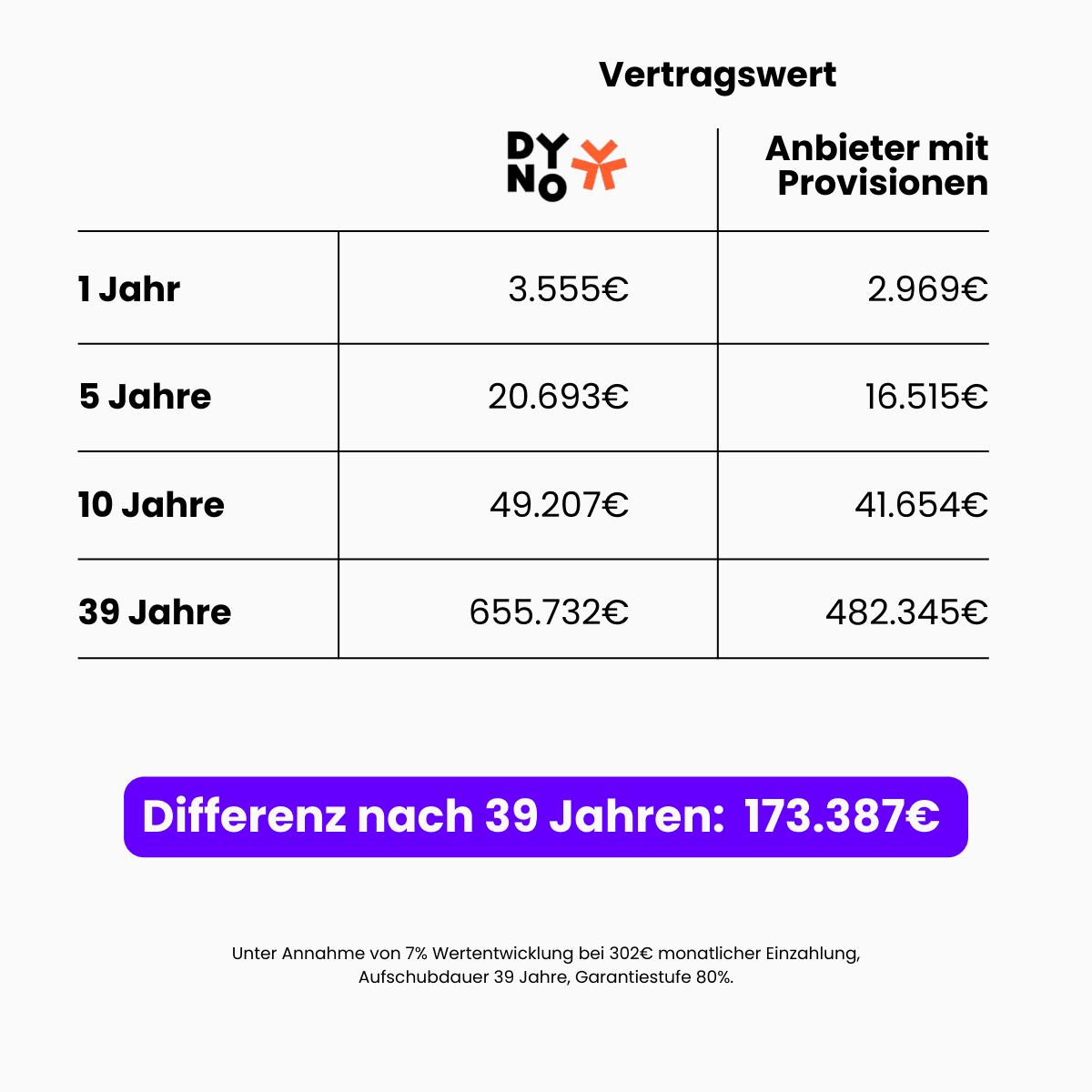 DYNO hingegen arbeitet ausschließlich mit provisionsfreien Nettoverträgen. Hier gibt es keine Abschluss- und Vertriebskosten. Alle Einzahlungen werden von Beginn an investiert, wodurch sich das Kapital deutlich schneller aufbaut.