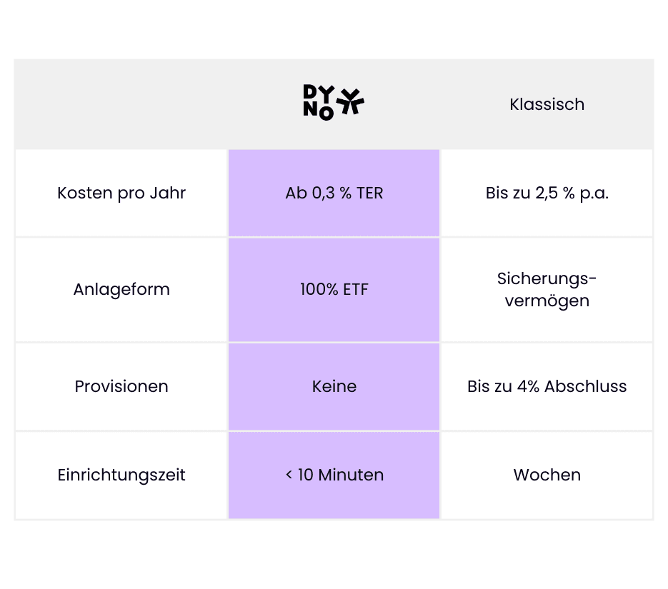 Ab 0,3 % TER sicherst du dir mit DYNO bis zu 300.000 Euro mehr Rente bei 100% Fondsquote.