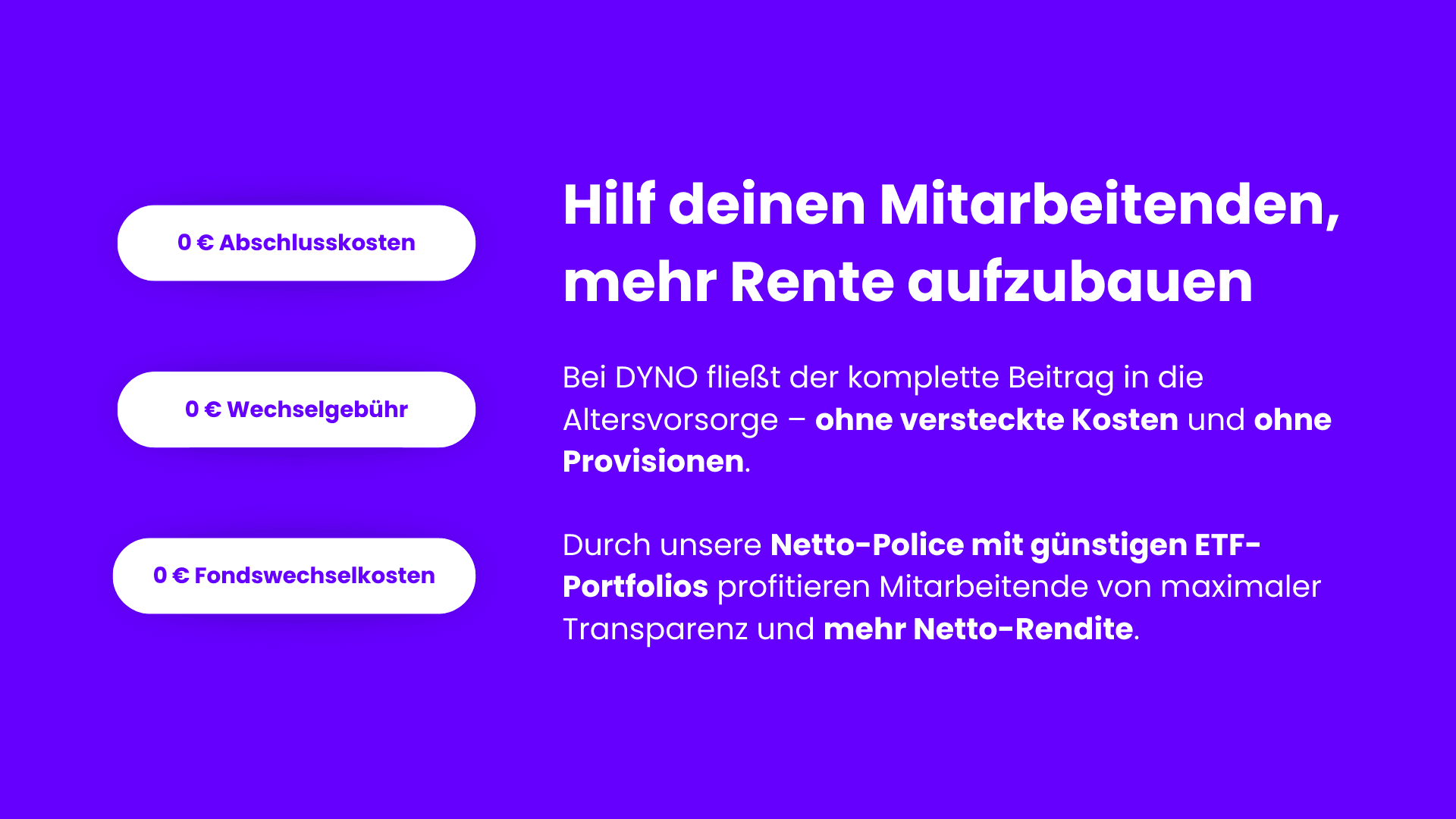 DYNO bietet Unternehmen eine moderne bAV-Lösung – provisionsfrei, transparent und staatlich gefördert. So kommt jeder Euro bei den Mitarbeitenden an.